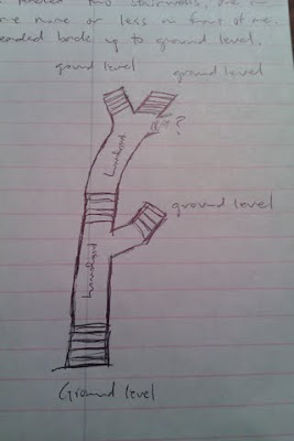 I turned back around and headed in the direction the little girl had been heading in before I'd called her back. At some point I reached two stairwells, one on my left, the other more or less infront of me. They both headed back up to ground level.